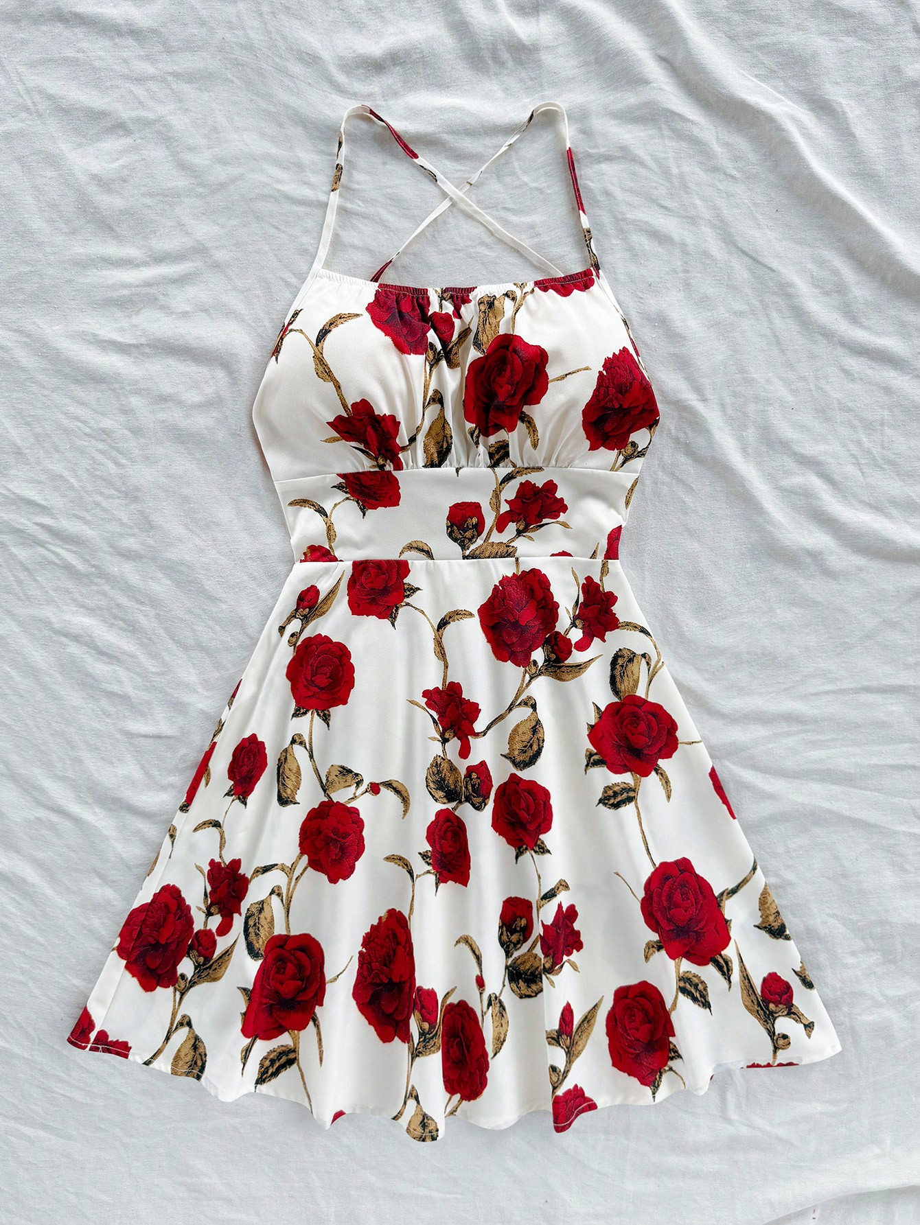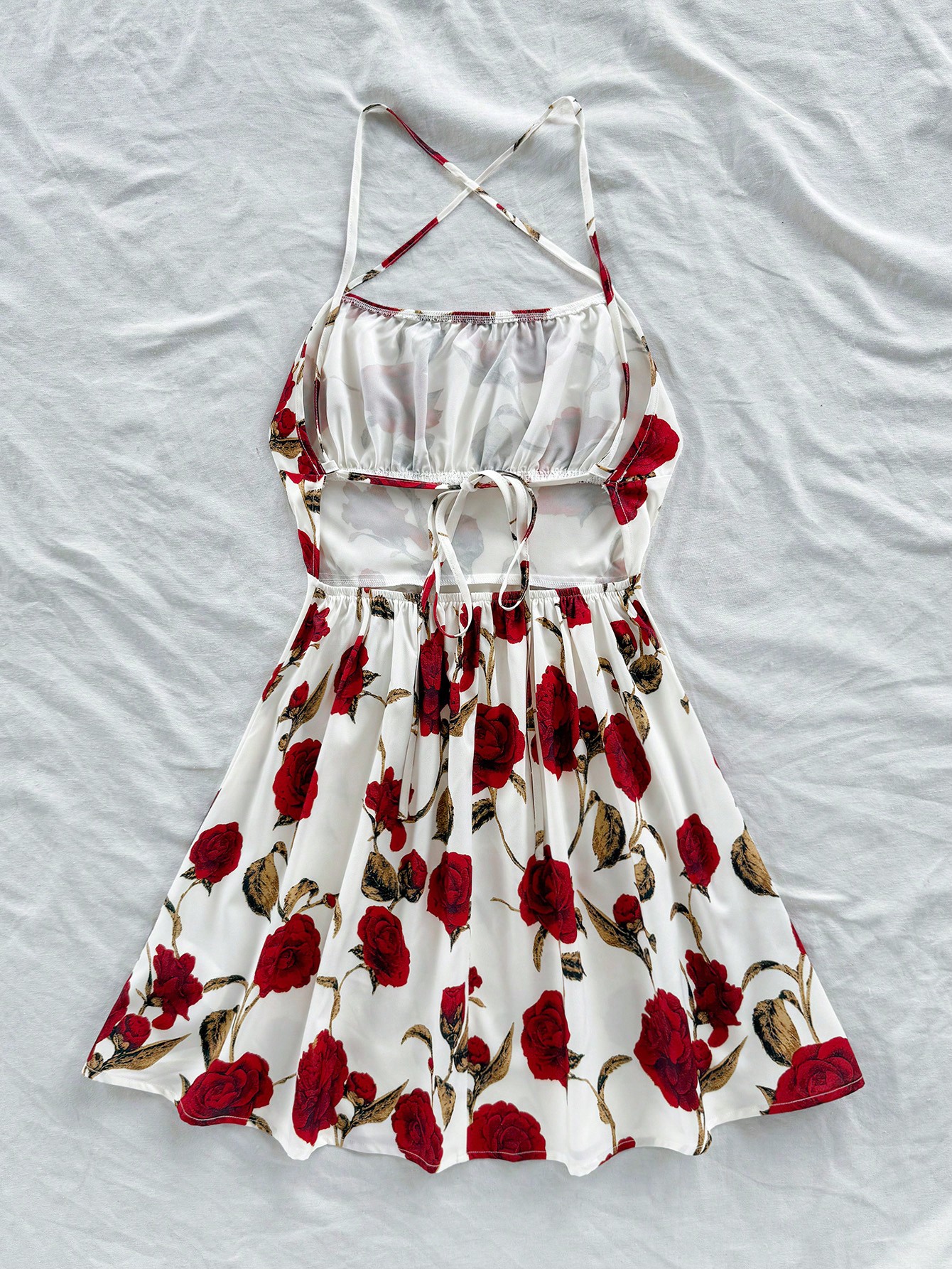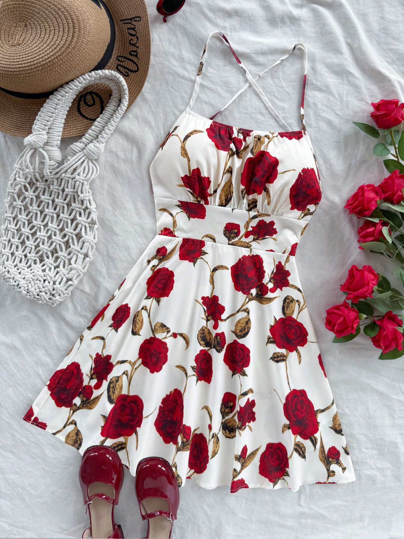 Soleia فستان ميني بخطوط سباغيتي وظهر مكشوف ذو طبعة زهور حمراء رومانسية تفتة، فستان صيفي أنيق وجذاب ل