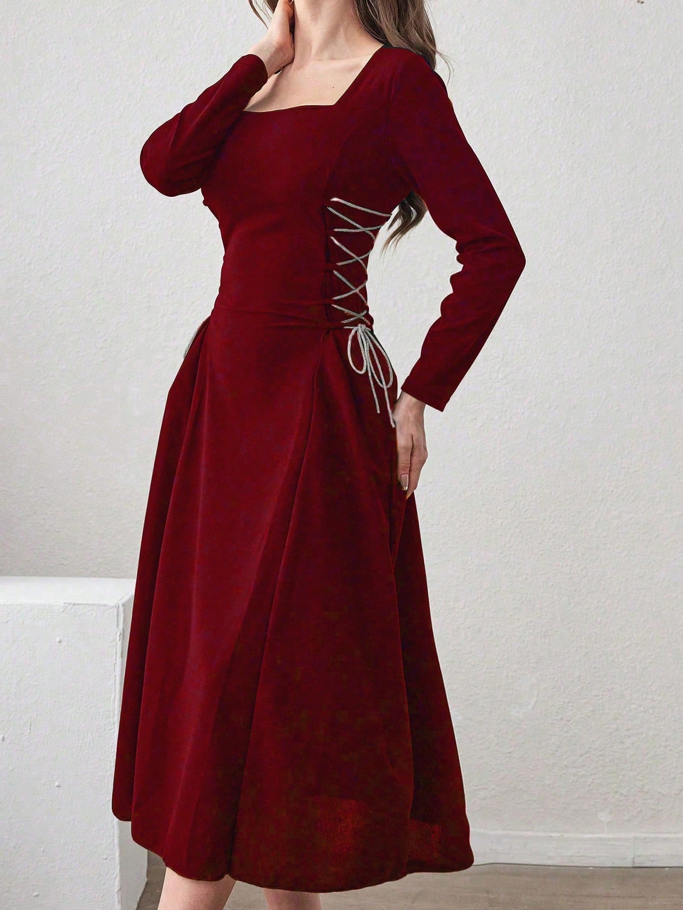 Modelyn فستان نسائي طويل الأكمام بياقة مربعة أنيق متوسط الطول مع ربطة خصر جانبية، لملابس السنة الجدي