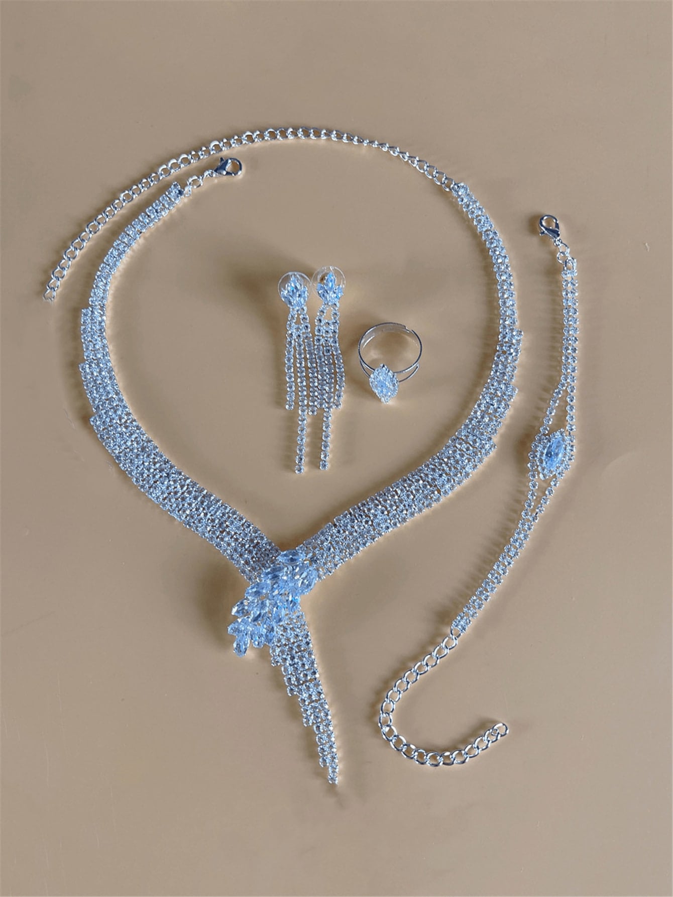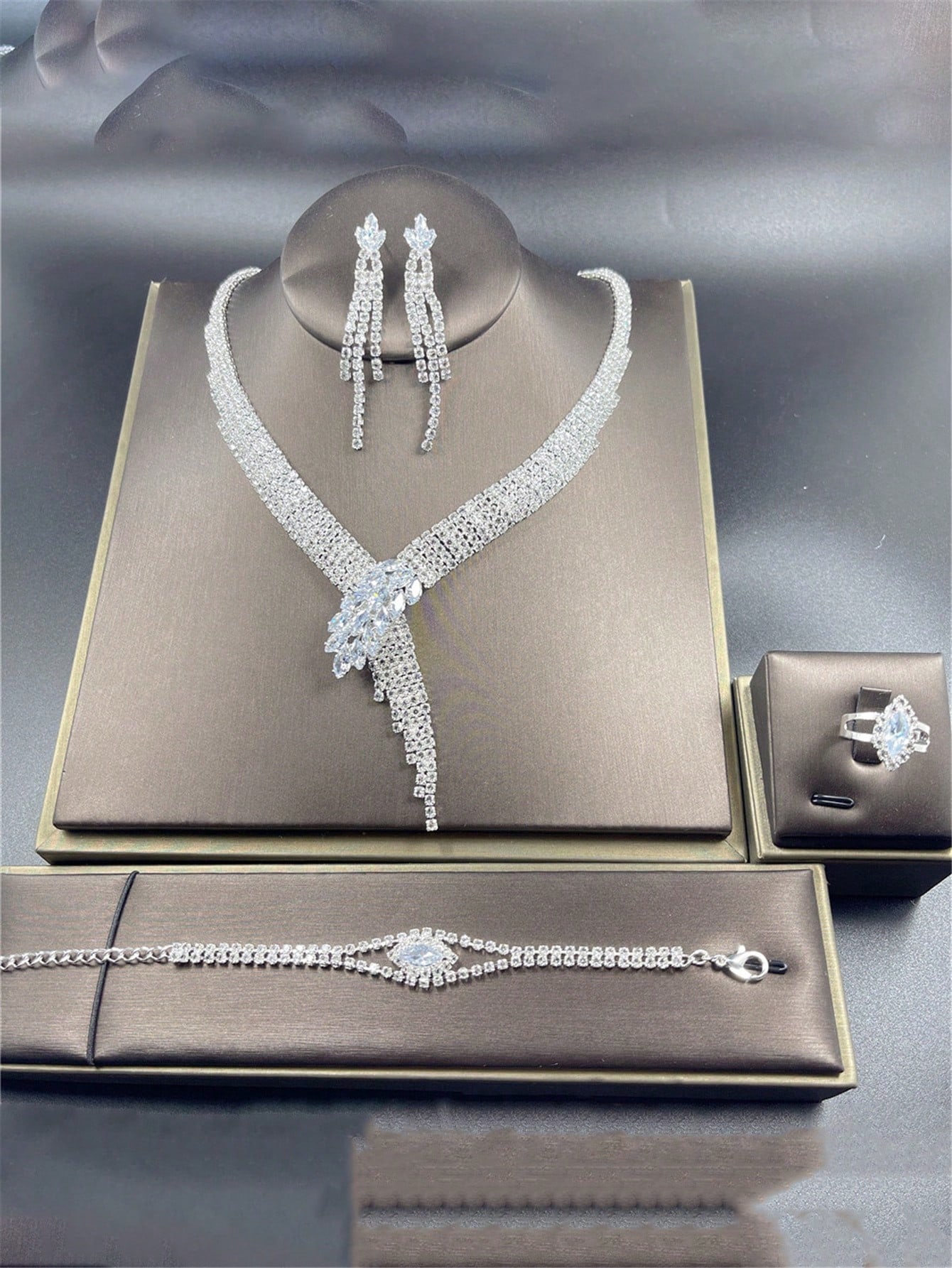 طقم مجوهرات فاخر من البلورات اللامعة 4 قطع ، قلادة وأقراط وخاتم وسوار زفاف للنساء