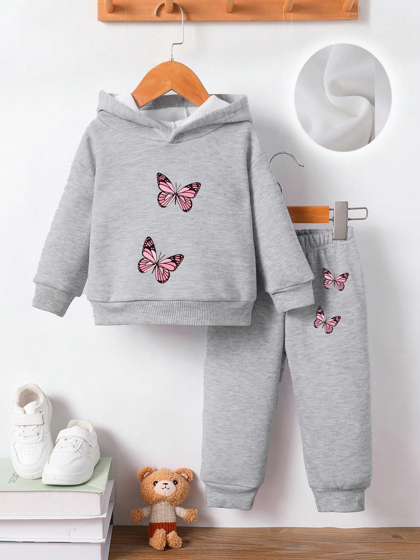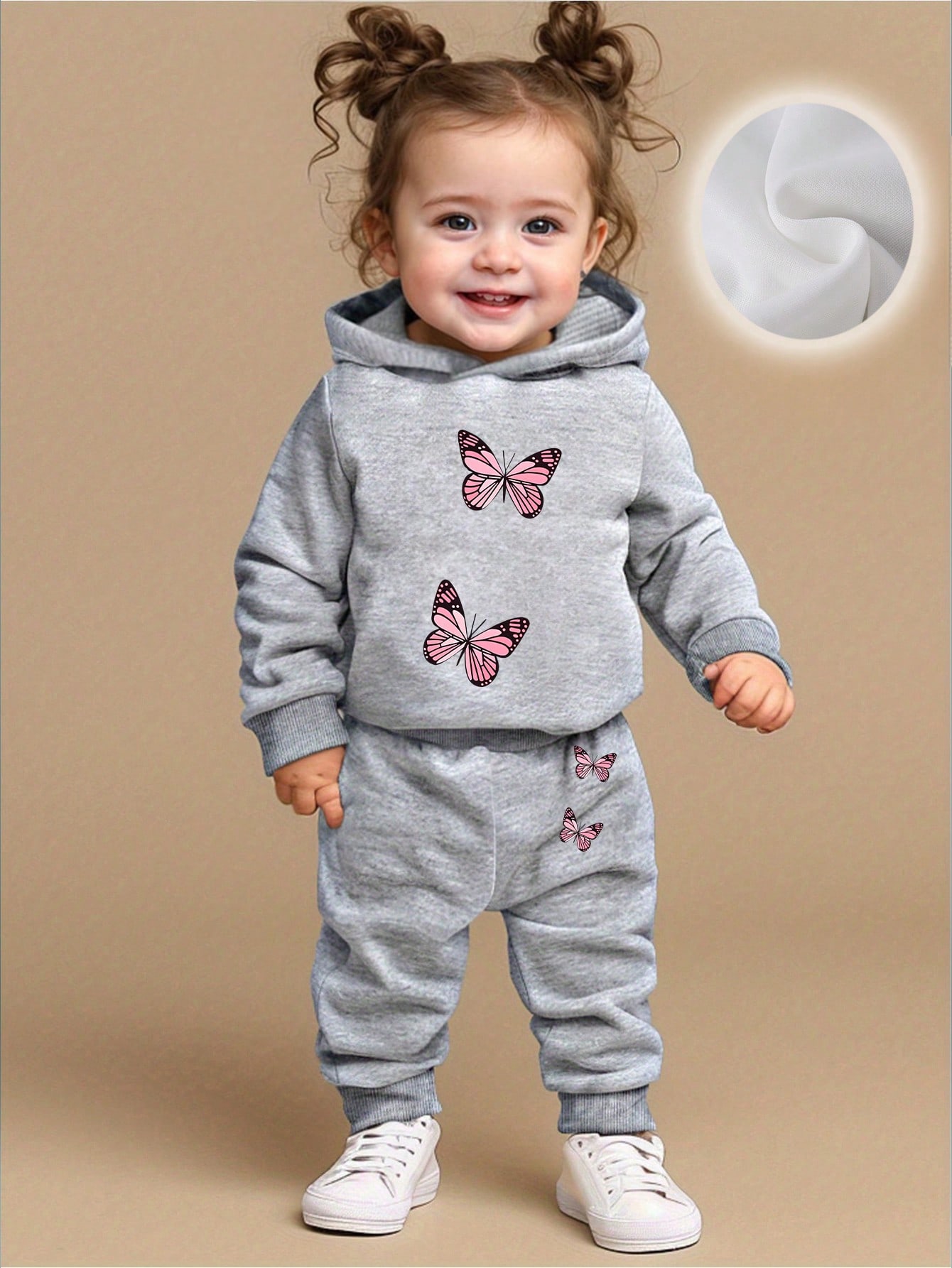 طقم بنطال وسترة هودي من الفليس مع طباعة الفراشة للبنات ، موضة كاجوال شتوية