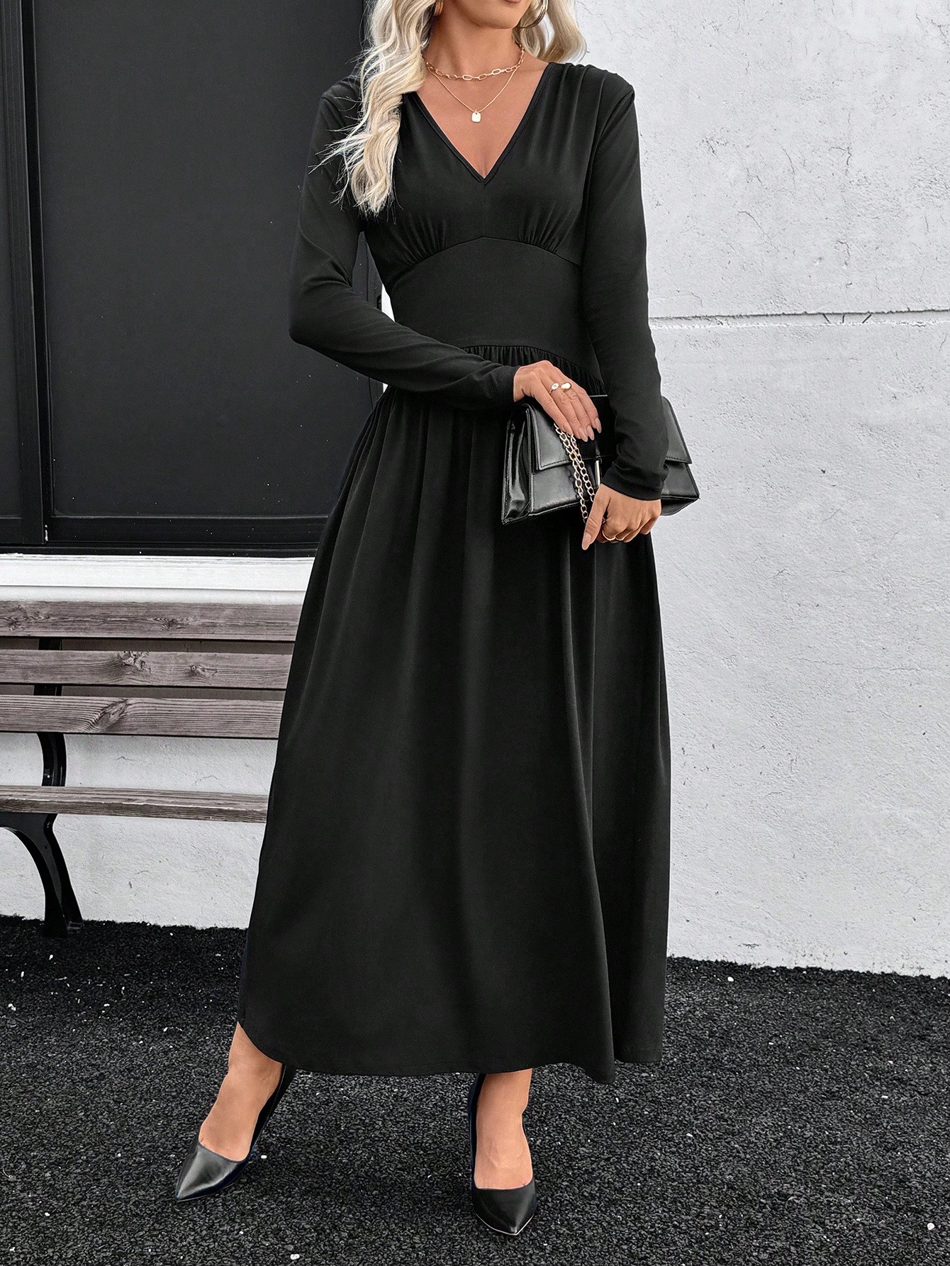 فستان أنيق بياقة على شكل حرف V وأكمام طويلة وخصر نحيف للنساء، للخريف/الشتاء