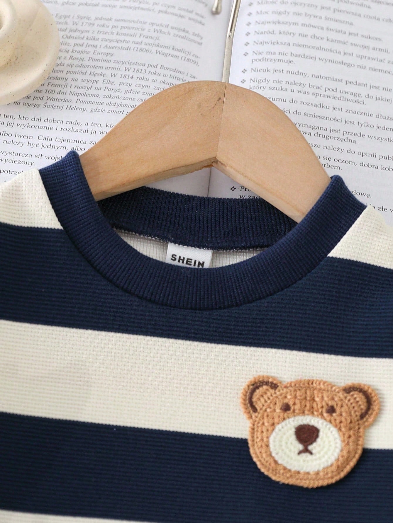 ملابس علوية طويل الأكمام بياقة طاقم مع رسومات دب جميلة، مع بنطال أزرق ضيق، طقم مل
